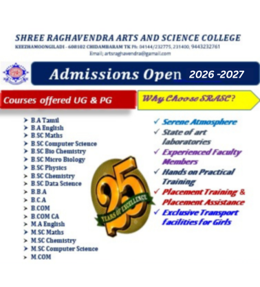 The Bachelor of Arts in Tamil (B.A. Tamil) program at Shree Raghavendra Arts and Science College is designed to provide a through